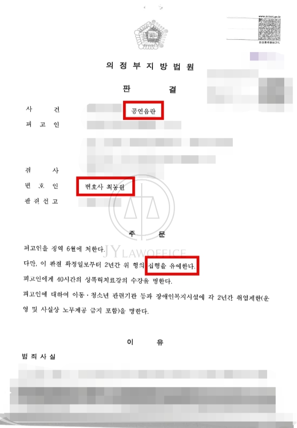 아청법위반(성매수) - 혐의없음성범죄[성공사례] 아청법위반(성매수) - 혐의없음 1. 사건 개요 본 사건의 의뢰인은 SNS에서 알게 된 이성에게 조건만남을 제안했고, 호텔에서 성관계를 가진 후 일정 금액을 이체하여 주었는데, 그로부터 며칠 뒤, 성매매 단속 중이던 수사기관에 의해 의뢰인의 채팅내용 및 이체내역이 적발되면서 의뢰인은 성매매 혐의로 경찰에 입건되고 말았습니다. 그런데 여기서 더 큰 문제는 상대방의 나이가 미성년자라는 사실이었고, 이 사실이 수사과정에서 드러나게 되면서 의뢰인의 혐의는 더욱 무거워졌습니다. 만남을 가졌을 당시 상대방이 자신을 성인으로 소개했기 때문에 이 상황이 너무나 당혹스러웠던 의뢰인은 아청법위반(성매수) 혐의가 유죄로 인정될 경우, 앞으로 취업활동에도 큰 제약이 따를 수 있을 것이 두려워 JY법률사무소의 조력을 통해서 억울한 입장을 소명하기로 결심하였습니다. 2. 변호인의 조력 ▷ 사건 진행상황애 대하여 수시로 체크하며 사건의 동향 확인 수사기관과의 꾸준한 커뮤니케이션으로 수시로 진행상황에 대해 확인하고 사건의 경위를 파악하는 것에 주력하였습니다. ▷ 경찰조사부터 재판까지 동행 및 예상 질문과 답변 피드백 ‘진술의 일관성’은 매우 중요합니다. 진술 내용은 그대로 수사기록에 남기 때문에 번복하기도 어렵고, 사건결과에 큰 영향을 줄 수 있습니다. 본 변호인은 이러한 점을 의뢰인에게 설명해주며, 경찰조사에 함께 동행하여 의뢰인이 불리한 답변 없이 성실하게 조사에 임하도록 조력하였습니다. ▷ 객관적 증거자료를 토대로 변호인의견서 작성 및 제출 본 변호인은 ▲ 미성년자와 만남을 가질 의도가 전혀 없었다는 점 ▲ 상대방이 성인의 신분증을 보여주었다는 점 등 증거자료를 바탕으로 변호인의견서를 상세하게 작성하였습니다. 3. 결과 이와 같은 변호인의 조력에 의뢰인은 검찰단계에서 혐의없음 처분을 받고 수사단계에서 사건을 종결시킬 수 있었습니다. 4. 처벌수위 ▷아동ㆍ청소년의 성보호에 관한 법률 제13조(아동ㆍ청소년의 성을 사는 행위 등) ① 아동ㆍ청소년의 성을 사는 행위를 한 자는 1년 이상 10년 이하의 징역 또는 2천만원 이상 5천만원 이하의 벌금에 처한다. ▷ 신상정보등록 성폭력범죄의 처벌 등에 관한 특례법 제42조(신상정보 등록대상자) ① 제2조제1항제3호ㆍ제4호, 같은 조 제2항(제1항제3호ㆍ제4호에 한정한다), 제3조부터 제15조까지의 범죄 및 「아동ㆍ청소년의 성보호에 관한 법률」 제2조제2호가목ㆍ라목의 범죄(이하 "등록대상 성범죄"라 한다)로 유죄판결이나 약식명령이 확정된 자 또는 같은 법 제49조제1항제4호에 따라 공개명령이 확정된 자는 신상정보 등록대상자(이하 "등록대상자"라 한다)가 된다. 다만, 제12조ㆍ제13조의 범죄 및 「아동ㆍ청소년의 성보호에 관한 법률」 제11조제3항 및 제5항의 범죄로 벌금형을 선고받은 자는 제외한다. ▷ 신상정보공개 아동ㆍ청소년의 성보호에 관한 법률 제49조(등록정보의 공개) ① 법원은 다음 각 호의 어느 하나에 해당하는 자에 대하여 판결로 제4항의 공개정보를「성폭력범죄의 처벌 등에 관한 특례법」 제45조제1항의 등록기간 동안 정보통신망을 이용하여 공개하도록 하는 명령(이하 "공개명령"이라 한다)을 등록대상 사건의 판결과 동시에 선고하여야 한다. 다만, 피고인이 아동ㆍ청소년인 경우, 그 밖에 신상정보를 공개하여서는 아니 될 특별한 사정이 있다고 판단하는 경우에는 그러하지 아니하다. 1. 아동ㆍ청소년대상 성폭력범죄를 저지른 자 2. 「성폭력범죄의 처벌 등에 관한 특례법」 제2조제1항제3호ㆍ제4호, 같은 조 제2항(제1항제3호ㆍ제4호에 한정한다), 제3조부터 제15조까지의 범죄를 저지른 자 ▷ 신상정보고지 아동ㆍ청소년의 성보호에 관한 법률 제50조(등록정보의 고지) ① 법원은 공개대상자 중 다음 각 호의 어느 하나에 해당하는 자에 대하여 판결로 제49조에 따른 공개명령 기간 동안 제4항에 따른 고지정보를 제5항에 규정된 사람에 대하여 고지하도록 하는 명령(이하 "고지명령"이라 한다)을 등록대상 성범죄 사건의 판결과 동시에 선고하여야 한다. 다만, 피고인이 아동ㆍ청소년인 경우, 그 밖에 신상정보를 고지하여서는 아니 될 특별한 사정이 있다고 판단하는 경우에는 그러하지 아니하다. 1. 아동ㆍ청소년대상 성폭력범죄를 저지른 자 2. 「성폭력범죄의 처벌 등에 관한 특례법」 제2조제1항제3호ㆍ제4호, 같은 조 제2항(제1항제3호ㆍ제4호에 한정한다), 제3조부터 제15조까지의 범죄를 저지른 자상담전화 02-582-4833