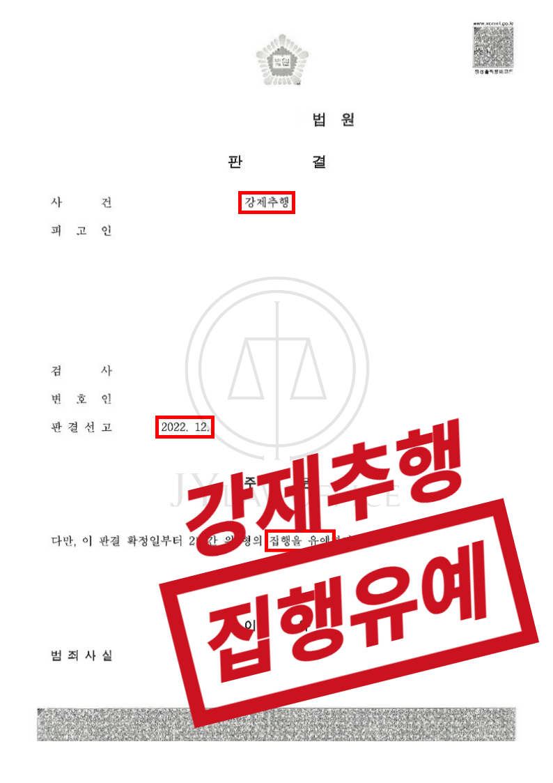 음주운전 2회 - 집행유예교통범죄[성공사례] 음주운전 2회 - 집행유예 1. 사건 개요 본 사건의 의뢰인은 동종범죄로 벌금형의 처벌을 받은 적이 있음에도 또다시 주취 상태로 차를 운행하여 '음주운전' 혐의를 받게 되었습니다. 이에 의뢰인은 범행을 반성하며 상황을 바로잡기 위해 본 JY법률사무소를 찾아주셨습니다. 2. 변호인의 조력 ▷ 혐의사실 파악 및 이에 따른 전략 수립 윤창호법 시행으로 인하여 음주운전에 대한 처벌 수위는 과거에 비하여 대폭 상승하게 되었습니다. 따라서 초범이라고 하더라도 재판까지 받고 검찰에서 징역형을 구형하는 사례들이 많아지고 있습니다. 다만 의뢰인은 동종 전과가 있어 더욱 위급한 상황이었기에, 본 변호인은 의뢰인이 음주운전을 한 사실은 인정하되 유리한 정상들을 확보하며 최대한 선처받을 수 있도록 변호 방향을 수립하였습니다. ▷ 경찰조사 대비 및 동행 이미 음주운전 전과가 있는 상황에서 다시 음주운전을 하고 사고까지 야기하였다면 단순히 구약식 기소가 되지는 않을 것이고, 검사가 구공판 기소 처분을 할 것입니다. 즉, 단순히 벌금형을 구형하는 것이 아닌 재판을 받게 되면서 검사가 징역형을 구형한다고 보시면 됩니다. 이에 본 변호인은, 의뢰인의 긍정적인 결과를 위해 경찰 조사에서 받게 될 예상 질문에 대한 답변을 안내하며 유리한 정상들을 극대화할 수 있도록 조력하였습니다. ▷ 유리한 증거 자료 확보 선처 피력 만약 의뢰인의 행위로 인적 및 물적 피해가 발생했다면 피해에 따른 배상은 물론 책임 범위가 더욱 넓어질 수 있습니다. 다만, ▲ 의뢰인은 자신의 범행을 인정하며 잘못을 반성하는 점 ▲ 의뢰인은 재범 예방을 위해 이 사건 범행에 사용한 자동차를 처분한 점 ▲ 다행히 음주운전 사고 등의 위험성이 현실화 되지 않은 점 의 모습을 보여주어, 본 변호인은 위 근거들을 토대로 변호인 의견서를 작성 및 제출하였습니다. 3. 결과 이와 같은 변호인의 조력에 따라, 의뢰인은 음주운전 혐의에 대해 '집행유예'판결을 받고 무사히 사건을 마무리할 수 있었습니다. 4. 처벌 수위 ▶도로교통법 제 44조(술에 취한 상태에서의 운전 금지) ① 누구든지 술에 취한 상태에서 자동차등(「건설기계관리법」 제26조제1항 단서에 따른 건설기계 외의 건설기계를 포함한다. 이하 이 조, 제45조, 제47조, 제93조제1항제1호부터 제4호까지 및 제148조의2에서 같다), 노면전차 또는 자전거를 운전하여서는 아니 된다. ② 경찰공무원은 교통의 안전과 위험방지를 위하여 필요하다고 인정하거나 제1항을 위반하여 술에 취한 상태에서 자동차등, 노면전차 또는 자전거를 운전하였다고 인정할 만한 상당한 이유가 있는 경우에는 운전자가 술에 취하였는지를 호흡조사로 측정할 수 있다. 이 경우 운전자는 경찰공무원의 측정에 응하여야 한다. ③ 제2항에 따른 측정 결과에 불복하는 운전자에 대하여는 그 운전자의 동의를 받아 혈액 채취 등의 방법으로 다시 측정할 수 있다. ④ 제1항에 따라 운전이 금지되는 술에 취한 상태의 기준은 운전자의 혈중알코올농도가 0.03퍼센트 이상인 경우로 한다. ▶도로교통법 제148조의2(벌칙) ① 제44조제1항 또는 제2항을 위반(자동차등 또는 노면전차를 운전한 경우로 한정한다. 다만, 개인형 이동장치를 운전한 경우는 제외한다. 이하 이 조에서 같다)하여 벌금 이상의 형을 선고받고 그 형이 확정된 날부터 10년 내에 다시 같은 조 제1항 또는 제2항을 위반한 사람(형이 실효된 사람도 포함한다)은 다음 각 호의 구분에 따라 처벌한다. 1. 제44조제2항을 위반한 사람은 1년 이상 6년 이하의 징역이나 500만원 이상 3천만원 이하의 벌금에 처한다. 2. 제44조제1항을 위반한 사람 중 혈중알코올농도가 0.2퍼센트 이상인 사람은 2년 이상 6년 이하의 징역이나 1천만원 이상 3천만원 이하의 벌금에 처한다. 3. 제44조제1항을 위반한 사람 중 혈중알코올농도가 0.03퍼센트 이상 0.2퍼센트 미만인 사람은 1년 이상 5년 이하의 징역이나 500만원 이상 2천만원 이하의 벌금에 처한다. ② 술에 취한 상태에 있다고 인정할 만한 상당한 이유가 있는 사람으로서 제44조제2항에 따른 경찰공무원의 측정에 응하지 아니하는 사람(자동차등 또는 노면전차를 운전한 경우로 한정한다)은 1년 이상 5년 이하의 징역이나 500만원 이상 2천만원 이하의 벌금에 처한다. ③ 제44조제1항을 위반하여 술에 취한 상태에서 자동차등 또는 노면전차를 운전한 사람은 다음 각 호의 구분에 따라 처벌한다. 1. 혈중알코올농도가 0.2퍼센트 이상인 사람은 2년 이상 5년 이하의 징역이나 1천만원 이상 2천만원 이하의 벌금 2. 혈중알코올농도가 0.08퍼센트 이상 0.2퍼센트 미만인 사람은 1년 이상 2년 이하의 징역이나 500만원 이상 1천만원 이하의 벌금 3. 혈중알코올농도가 0.03퍼센트 이상 0.08퍼센트 미만인 사람은 1년 이하의 징역이나 500만원 이하의 벌금 ④ 제45조를 위반하여 약물로 인하여 정상적으로 운전하지 못할 우려가 있는 상태에서 자동차등 또는 노면전차를 운전한 사람은 3년 이하의 징역이나 1천만원 이하의 벌금에 처한다.상담전화 02-582-4833
