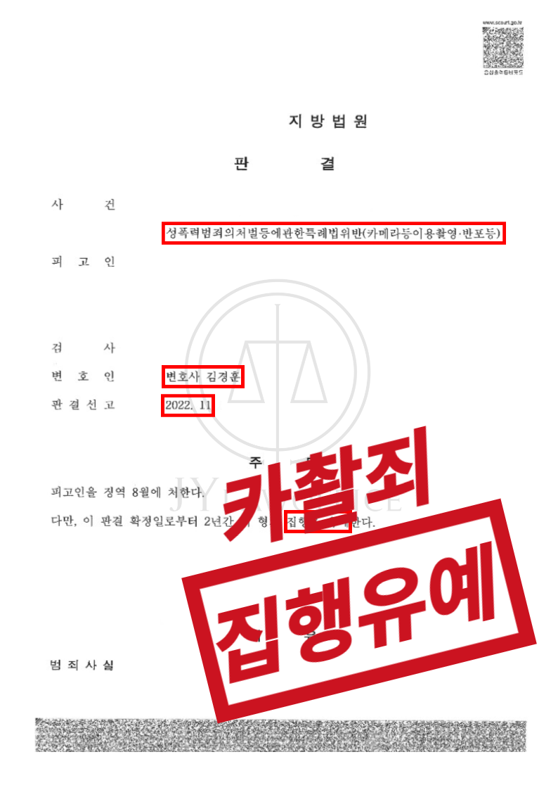 강제추행 - 검사측 항소 기각 -> 최종 무죄성범죄[성공사례] 강제추행 - 검사측 항소 기각 -> 최종 무죄 1. 사건 개요 본 사건의 의뢰인은 강제추행 혐의를 받았으나, 본 JY법률사무소의 조력으로 원심에서 '무죄' 판결을 받았습니다. 그러나 검사 측의 항소로 또다시 법정에 서야 했던 의뢰인은, 다시 한번 JY법률사무소와 함께 사건 대응에 힘썼습니다. 2. 변호인의 조력 원심은 의뢰인의 범행이 계획과 목적이 없는 것은 물론, 의뢰인의 유죄를 입증할 만한 충분한 증거가 없다는 점을 근거로 공소사실을 무죄로 판단하였습니다. 그러나 검사 측은 미필적이나마 피해자를 강제로 추행하려는 고의가 있었음에도 원심에서 이를 인정하지 않고 무죄를 선고하였다며, 원심판결에 대한 위법을 주장하며 항소하였습니다. 이에 본 변호인은, 의뢰인의 행위를 유죄로 인정하기 위해서는 합리적인 의심의 여지가 없는 진실한 증거에 기반하여야 함을 주장하며, 검사 측의 주장은 충분한 증명이 될 수 없음을 피력하였습니다. 또한 원심의 판단은 정당하고, 검사의 항소는 이유 없음을 강하게 주장하며 항소심에 적극 대응하였습니다. 3. 결과 의뢰인은 이와 같은 변호인의 조력에 따라, 강제추행 혐의에 대해서 최종 무죄를 선고받고 무사히 사건을 종결시킬 수 있었습니다. 4. 처벌수위 ▶형법 제298조(강제추행) 폭행 또는 협박으로 사람에 대하여 추행을 한 자는 10년 이하의 징역 또는 1천500만원 이하의 벌금에 처한다. ▷ 신상정보등록 성폭력범죄의 처벌 등에 관한 특례법 제42조(신상정보 등록대상자) ① 제2조제1항제3호ㆍ제4호, 같은 조 제2항(제1항제3호ㆍ제4호에 한정한다), 제3조부터 제15조까지의 범죄 및 「아동ㆍ청소년의 성보호에 관한 법률」 제2조제2호가목ㆍ라목의 범죄(이하 "등록대상 성범죄"라 한다)로 유죄판결이나 약식명령이 확정된 자 또는 같은 법 제49조제1항제4호에 따라 공개명령이 확정된 자는 신상정보 등록대상자(이하 "등록대상자"라 한다)가 된다. 다만, 제12조ㆍ제13조의 범죄 및 「아동ㆍ청소년의 성보호에 관한 법률」 제11조제3항 및 제5항의 범죄로 벌금형을 선고받은 자는 제외한다. ▷ 신상정보공개 아동ㆍ청소년의 성보호에 관한 법률 제49조(등록정보의 공개) ① 법원은 다음 각 호의 어느 하나에 해당하는 자에 대하여 판결로 제4항의 공개정보를「성폭력범죄의 처벌 등에 관한 특례법」 제45조제1항의 등록기간 동안 정보통신망을 이용하여 공개하도록 하는 명령(이하 "공개명령"이라 한다)을 등록대상 사건의 판결과 동시에 선고하여야 한다. 다만, 피고인이 아동ㆍ청소년인 경우, 그 밖에 신상정보를 공개하여서는 아니 될 특별한 사정이 있다고 판단하는 경우에는 그러하지 아니하다. 1. 아동ㆍ청소년대상 성폭력범죄를 저지른 자 2. 「성폭력범죄의 처벌 등에 관한 특례법」 제2조제1항제3호ㆍ제4호, 같은 조 제2항(제1항제3호ㆍ제4호에 한정한다), 제3조부터 제15조까지의 범죄를 저지른 자 ▷ 신상정보고지 아동ㆍ청소년의 성보호에 관한 법률 제50조(등록정보의 고지) ① 법원은 공개대상자 중 다음 각 호의 어느 하나에 해당하는 자에 대하여 판결로 제49조에 따른 공개명령 기간 동안 제4항에 따른 고지정보를 제5항에 규정된 사람에 대하여 고지하도록 하는 명령(이하 "고지명령"이라 한다)을 등록대상 성범죄 사건의 판결과 동시에 선고하여야 한다. 다만, 피고인이 아동ㆍ청소년인 경우, 그 밖에 신상정보를 고지하여서는 아니 될 특별한 사정이 있다고 판단하는 경우에는 그러하지 아니하다. 1. 아동ㆍ청소년대상 성폭력범죄를 저지른 자 2. 「성폭력범죄의 처벌 등에 관한 특례법」 제2조제1항제3호ㆍ제4호, 같은 조 제2항(제1항제3호ㆍ제4호에 한정한다), 제3조부터 제15조까지의 범죄를 저지른 자상담전화 02-582-4833