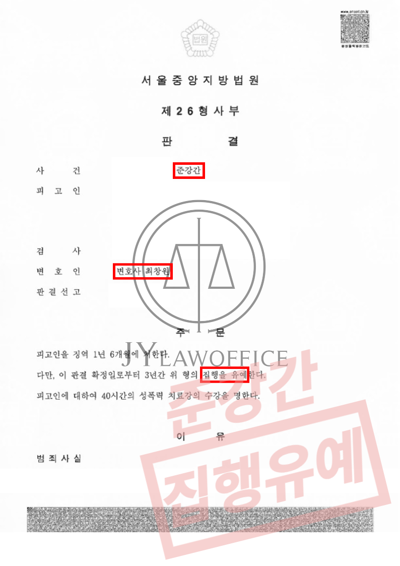 강제추행 - 집행유예성범죄[성공사례] 강제추행 - 집행유예 1. 사건 개요 본 사건의 의뢰인은 피해자로부터 거절의 의사표시를 들었음에도 반복적으로 피해자를 추행하여 '강제추행'혐의가 적용되었습니다. 이에 의뢰인은 법리적인 자문을 구하고자 본 JY법률사무소를 찾아와 주셨습니다. 2. 변호인의 조력 ▷ 사건 분석 및 추후 대응 방안 수립 본 변호인은 사건 당시 발생한 모든 일을 시간의 흐름대로 정리하여 사건 발생 경위를 파악하였고, 최소한의 처분을 위해 담당 수사기관과의 소통 및 정보공개청구 등을 통해 유리한 대응 방안을 수립하였습니다. ▷ 경찰 조사 준비 및 수사 기관 동행 경찰 조사 단계에서 피의자에 진술은 사건 처분에 매우 중대한 영향을 미치게 됩니다. 만약 불리한 진술로 벌금형 이상의 처분이 내려진다면, 형사 처분과는 별개로 사회적 제약이 따르는 보안처분이 함께 내려질 수 있어 철저한 사전 준비가 필요합니다. 이에 본 변호인은 의뢰인에게 유리한 정상을 확인하여 경찰 조사에서 예상되는 질문과 답변을 전달 드렸고, 조사 당일 함께 출석하여 무사히 진술을 마칠 수 있도록 조력하였습니다. ▷ 피해자와 원만한 합의 성사 강제추행과 같은 성범죄는 피해자와의 합의 여부에 따라 사건 처분이 달라질 수 있어 합의를 위한 노력이 필요합니다. 다만, 피해자와의 직접적인 만남은 2차 가해에 대한 추가 형량이 따를 수 있으므로 본 변호인은 의뢰인을 대신하여 피해자와 접촉해 원만한 합의를 이끌어냈습니다. 이를 토대로, ▲ 의뢰인은 자신의 범행을 뉘우치며 반성하는 점 ▲ 의뢰인은 피해 회복을 위해 노력하였고, 피해자로부터 처벌 불원의 의사를 전달받은 점 ▲ 의뢰인은 과거 벌금형 이상의 처분을 받은 전력이 없는 점 등을 근거로 의뢰인의 선처를 적극 피력하였습니다. 3. 결과 이와 같은 변호인의 조력에 따라, 의뢰인은 집행유예 처분을 받고 사건을 무사히 마무리할 수 있었습니다. 4. 처벌 수위 ▶ 형법 제298조(강제추행) 폭행 또는 협박으로 사람에 대하여 추행을 한 자는 10년 이하의 징역 또는 1천500만원 이하의 벌금에 처한다. ▷ 신상정보등록 성폭력범죄의 처벌 등에 관한 특례법 제42조(신상정보 등록대상자) ① 제2조제1항제3호ㆍ제4호, 같은 조 제2항(제1항제3호ㆍ제4호에 한정한다), 제3조부터 제15조까지의 범죄 및 「아동ㆍ청소년의 성보호에 관한 법률」 제2조제2호가목ㆍ라목의 범죄(이하 "등록대상 성범죄"라 한다)로 유죄판결이나 약식명령이 확정된 자 또는 같은 법 제49조제1항제4호에 따라 공개명령이 확정된 자는 신상정보 등록대상자(이하 "등록대상자"라 한다)가 된다. 다만, 제12조ㆍ제13조의 범죄 및 「아동ㆍ청소년의 성보호에 관한 법률」 제11조제3항 및 제5항의 범죄로 벌금형을 선고받은 자는 제외한다. ▷ 신상정보공개 아동ㆍ청소년의 성보호에 관한 법률 제49조(등록정보의 공개) ① 법원은 다음 각 호의 어느 하나에 해당하는 자에 대하여 판결로 제4항의 공개정보를「성폭력범죄의 처벌 등에 관한 특례법」 제45조제1항의 등록기간 동안 정보통신망을 이용하여 공개하도록 하는 명령(이하 "공개명령"이라 한다)을 등록대상 사건의 판결과 동시에 선고하여야 한다. 다만, 피고인이 아동ㆍ청소년인 경우, 그 밖에 신상정보를 공개하여서는 아니 될 특별한 사정이 있다고 판단하는 경우에는 그러하지 아니하다. 1. 아동ㆍ청소년대상 성폭력범죄를 저지른 자 2. 「성폭력범죄의 처벌 등에 관한 특례법」 제2조제1항제3호ㆍ제4호, 같은 조 제2항(제1항제3호ㆍ제4호에 한정한다), 제3조부터 제15조까지의 범죄를 저지른 자 ▷ 신상정보고지 아동ㆍ청소년의 성보호에 관한 법률 제50조(등록정보의 고지) ① 법원은 공개대상자 중 다음 각 호의 어느 하나에 해당하는 자에 대하여 판결로 제49조에 따른 공개명령 기간 동안 제4항에 따른 고지정보를 제5항에 규정된 사람에 대하여 고지하도록 하는 명령(이하 "고지명령"이라 한다)을 등록대상 성범죄 사건의 판결과 동시에 선고하여야 한다. 다만, 피고인이 아동ㆍ청소년인 경우, 그 밖에 신상정보를 고지하여서는 아니 될 특별한 사정이 있다고 판단하는 경우에는 그러하지 아니하다. 1. 아동ㆍ청소년대상 성폭력범죄를 저지른 자 2. 「성폭력범죄의 처벌 등에 관한 특례법」 제2조제1항제3호ㆍ제4호, 같은 조 제2항(제1항제3호ㆍ제4호에 한정한다), 제3조부터 제15조까지의 범죄를 저지른 자상담전화 02-582-4833