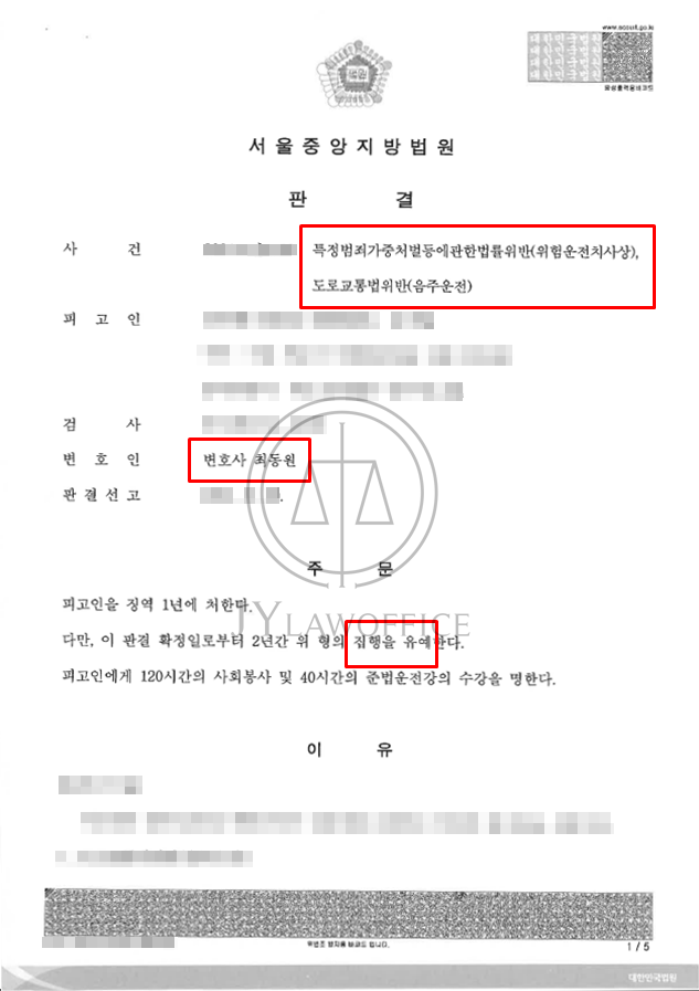 음주운전 - 벌금형교통범죄[성공사례] 음주운전 - 벌금형 1. 사건개요 본 사건의 의뢰인은 음주 후 약 50m 상당의 구간을 운전하였습니다. 그러나 얼마 지나지 않아 음주 단속 중인 경찰관에게 음주 사실이 발각되었고, 이에 대한 대응 방안을 모색하기 위하여 JY법률사무소를 찾아 사건을 의뢰하게 되었습니다. 2. 변호인의 조력 ▷ 수시 체크 및 절차에 따른 법률 조력 수행 본 변호인은 의뢰인과의 상담으로 인정사건으로 전략을 수립하였으며, 수사기관과의 긴밀한 커뮤니케이션을 통해 매일 진행 상황을 살펴 대응 방향을 설정하였습니다. 또한 최근 음주운전에 대한 사회적 인식으로 처벌 수위가 무거운 것을 인지하고 있던 본 변호인은 의뢰인의 손해를 최소화하기 위해 계획을 구상하여 적절한 법률 조력을 전달하였습니다. ▷ 수사기관·법원 동행 및 양형자료 수집 본 변호인은 의뢰인의 처벌 수위를 낮추기 위해 다양한 양형 자료를 수집하였고 경찰조사의 예상 질의응답을 안내해 드렸습니다. 또한 경찰조사 및 재판에 동행하여 심리적인 안정을 찾을 수 있도록 힘을 보탰습니다. 본 변호인은 이러한 과정을 통해, 의뢰인이 음주 상태로 차량을 운전한 것은 사실이지만, ▲ 의뢰인이 자신의 행동을 진심으로 반성하고 뉘우치고 있는 점 ▲ 의뢰인이 이전에 동종전력이 없다는 점 ▲ 사건 당시 의뢰인의 혈중알코올농도가 매우 미미했다는 점 등을 주장하며 의뢰인에게 유리한 결과를 도출할 수 있도록 의견서를 제출하며 의뢰인의 선처를 적극적으로 피력하였습니다. 3. 결과 이와 같은 변호인의 노력에 따라 의뢰인은 벌금형 판결을 받고 사건을 무사히 마무리할 수 있었습니다. 4. 처벌 수위 ▶도로교통법 제 44조(술에 취한 상태에서의 운전 금지) ① 누구든지 술에 취한 상태에서 자동차등(「건설기계관리법」 제26조제1항 단서에 따른 건설기계 외의 건설기계를 포함한다. 이하 이 조, 제45조, 제47조, 제93조제1항제1호부터 제4호까지 및 제148조의2에서 같다), 노면전차 또는 자전거를 운전하여서는 아니 된다. ② 경찰공무원은 교통의 안전과 위험방지를 위하여 필요하다고 인정하거나 제1항을 위반하여 술에 취한 상태에서 자동차등, 노면전차 또는 자전거를 운전하였다고 인정할 만한 상당한 이유가 있는 경우에는 운전자가 술에 취하였는지를 호흡조사로 측정할 수 있다. 이 경우 운전자는 경찰공무원의 측정에 응하여야 한다. ③ 제2항에 따른 측정 결과에 불복하는 운전자에 대하여는 그 운전자의 동의를 받아 혈액 채취 등의 방법으로 다시 측정할 수 있다. ④ 제1항에 따라 운전이 금지되는 술에 취한 상태의 기준은 운전자의 혈중알코올농도가 0.03퍼센트 이상인 경우로 한다. ▶도로교통법 제148조의2(벌칙) ① 제44조제1항 또는 제2항을 2회 이상 위반한 사람(자동차등 또는 노면전차를 운전한 사람으로 한정한다. 다만, 개인형 이동장치를 운전하는 경우는 제외한다. 이하 이 조에서 같다)은 2년 이상 5년 이하의 징역이나 1천만원 이상 2천만원 이하의 벌금에 처한다. ② 술에 취한 상태에 있다고 인정할 만한 상당한 이유가 있는 사람으로서 제44조제2항에 따른 경찰공무원의 측정에 응하지 아니하는 사람(자동차등 또는 노면전차를 운전하는 사람으로 한정한다)은 1년 이상 5년 이하의 징역이나 500만원 이상 2천만원 이하의 벌금에 처한다. ③ 제44조제1항을 위반하여 술에 취한 상태에서 자동차등 또는 노면전차를 운전한 사람은 다음 각 호의 구분에 따라 처벌한다. 1. 혈중알코올농도가 0.2퍼센트 이상인 사람은 2년 이상 5년 이하의 징역이나 1천만원 이상 2천만원 이하의 벌금 2. 혈중알코올농도가 0.08퍼센트 이상 0.2퍼센트 미만인 사람은 1년 이상 2년 이하의 징역이나 500만원 이상 1천만원 이하의 벌금 3. 혈중알코올농도가 0.03퍼센트 이상 0.08퍼센트 미만인 사람은 1년 이하의 징역이나 500만원 이하의 벌금 ④ 제45조를 위반하여 약물로 인하여 정상적으로 운전하지 못할 우려가 있는 상태에서 자동차등 또는 노면전차를 운전한 사람은 3년 이하의 징역이나 1천만원 이하의 벌금에 처한다.상담전화 02-582-4833