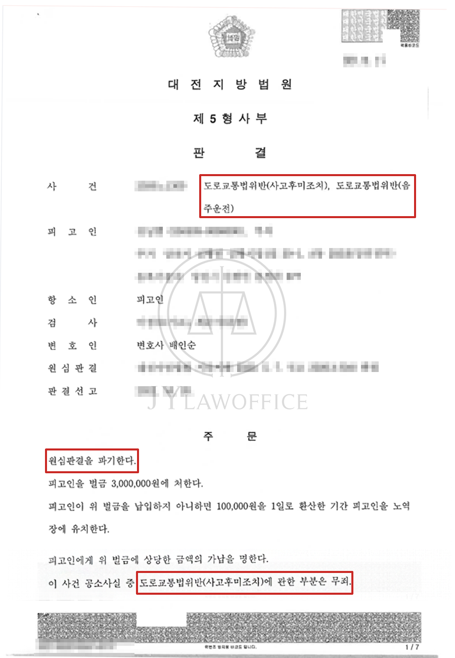 무면허운전, 음주운전 2회 - 집행유예교통범죄[성공사례] 무면허운전, 음주운전 2회 등 - 집행유예 1. 사건 개요 본 사건 의뢰인은 지인들과 술을 마신 후 귀가하는 과정에서 비교적 가까운 거리에 방심한 채, 과거 음주운전 전력으로 면허가 취소된 상태였음에도 불구하고 또다시 혈중알코올농도가 높은 상태에서 운전대를 잡게 되었습니다. 그런데 때마침 음주단속을 하고 있던 경찰 공무원에 의해 의뢰인의 음주 상태에서의 무면허운전은 적발되고 말았고, 이로 인해 의뢰인은 음주운전과 무면허운전의 혐의를 받게 되었습니다. 여기에서 더 나아가, 의뢰인은 이미 음주운전 전력이 있었고 재범한 시간적 간격도 짧았기 때문에 법정구속으로 직결될 위험성이 있었습니다. 이에 무거운 처벌이 두려웠던 의뢰인은 JY법률사무소를 찾아 사건을 정식 의뢰하였습니다. 2. 변호인의 조력 ▷ 의뢰인과 상담 및 수사기관과의 소통을 통해 사실관계 파악 이 사건 의뢰인은 이미 동종 전과가 있던 동시에 단 시간 내 무면허운전 또한 연이어 저지른 혐의까지 받고 있었고, 실형 가능성이 매우 높은 상황이었습니다. 이에 큰 처벌을 피하기 위한 자료를 수집하는 것이 중요하였습니다. 이를 잘 알고 있는 본 변호인은 의뢰인과의 상담으로 기본적인 사건 경위를 파악하고 수사기관과 수시로 소통을 진행하며 수사 정도에 대하여 체크하고 그에 맞는 대응 전략을 수립하는 것에 주력하였습니다. ▷ 경찰 조사 및 재판 마지막까지 동행 본 사건 의뢰인은 음주운전 재범에 무면허운전까지, 매우 불리한 상황이었으며 이에 심리적으로 매우 위축된 상태였습니다. 자칫 미숙한 대처를 할 경우 최종 처분에 영향을 줄 수 있기 때문에 본 변호인은 경찰 조사 및 재판에 동행하여 의뢰인의 진술에 힘을 보탰습니다. 또한, 처벌의 수위를 낮추기 위해 의뢰인이 진지한 반성을 하고 있으며, 다시는 재범하지 않겠다고 다짐한 부분을 상세히 소명하였습니다. 이러한 과정을 통해 ▲ 의뢰인은 자신의 잘못을 인정하고 진심으로 반성하고 있는 점, ▲ 의뢰인은 동종 전과 외 다른 처벌 전력이 없는 점, 등 의뢰인에게 유리한 양형자료를 수집하고 의뢰인의 선처를 적극적으로 피력하였습니다. 3. 결과 이와 같은 변호인의 조력에 따라, 의뢰인은 집행유예 판결을 받고 사건을 마무리할 수 있었습니다. 4. 처벌 수위 ▶도로교통법 제43조(무면허운전 등의 금지) 누구든지 제80조에 따라 시ㆍ도경찰청장으로부터 운전면허를 받지 아니하거나 운전면허의 효력이 정지된 경우에는 자동차등을 운전하여서는 아니 된다. ▶도로교통법 제 44조(술에 취한 상태에서의 운전 금지) ① 누구든지 술에 취한 상태에서 자동차등(「건설기계관리법」 제26조제1항 단서에 따른 건설기계 외의 건설기계를 포함한다. 이하 이 조, 제45조, 제47조, 제93조제1항제1호부터 제4호까지 및 제148조의2에서 같다), 노면전차 또는 자전거를 운전하여서는 아니 된다. ② 경찰공무원은 교통의 안전과 위험방지를 위하여 필요하다고 인정하거나 제1항을 위반하여 술에 취한 상태에서 자동차등, 노면전차 또는 자전거를 운전하였다고 인정할 만한 상당한 이유가 있는 경우에는 운전자가 술에 취하였는지를 호흡조사로 측정할 수 있다. 이 경우 운전자는 경찰공무원의 측정에 응하여야 한다. ③ 제2항에 따른 측정 결과에 불복하는 운전자에 대하여는 그 운전자의 동의를 받아 혈액 채취 등의 방법으로 다시 측정할 수 있다. ④ 제1항에 따라 운전이 금지되는 술에 취한 상태의 기준은 운전자의 혈중알코올농도가 0.03퍼센트 이상인 경우로 한다. ▶도로교통법 제148조의2(벌칙) ① 제44조제1항 또는 제2항을 2회 이상 위반한 사람(자동차등 또는 노면전차를 운전한 사람으로 한정한다. 다만, 개인형 이동장치를 운전하는 경우는 제외한다. 이하 이 조에서 같다)은 2년 이상 5년 이하의 징역이나 1천만원 이상 2천만원 이하의 벌금에 처한다. ② 술에 취한 상태에 있다고 인정할 만한 상당한 이유가 있는 사람으로서 제44조제2항에 따른 경찰공무원의 측정에 응하지 아니하는 사람(자동차등 또는 노면전차를 운전하는 사람으로 한정한다)은 1년 이상 5년 이하의 징역이나 500만원 이상 2천만원 이하의 벌금에 처한다. ③ 제44조제1항을 위반하여 술에 취한 상태에서 자동차등 또는 노면전차를 운전한 사람은 다음 각 호의 구분에 따라 처벌한다. 1. 혈중알코올농도가 0.2퍼센트 이상인 사람은 2년 이상 5년 이하의 징역이나 1천만원 이상 2천만원 이하의 벌금 2. 혈중알코올농도가 0.08퍼센트 이상 0.2퍼센트 미만인 사람은 1년 이상 2년 이하의 징역이나 500만원 이상 1천만원 이하의 벌금 3. 혈중알코올농도가 0.03퍼센트 이상 0.08퍼센트 미만인 사람은 1년 이하의 징역이나 500만원 이하의 벌금 ④ 제45조를 위반하여 약물로 인하여 정상적으로 운전하지 못할 우려가 있는 상태에서 자동차등 또는 노면전차를 운전한 사람은 3년 이하의 징역이나 1천만원 이하의 벌금에 처한다. ▶도로교통법 제152조(벌칙) 다음 각 호의 어느 하나에 해당하는 사람은 1년 이하의 징역이나 300만원 이하의 벌금에 처한다. 1. 제43조를 위반
